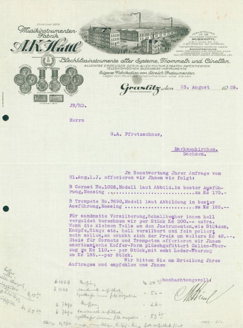 A.K. Hüttl, Graslitz, vom 23. August 1929.